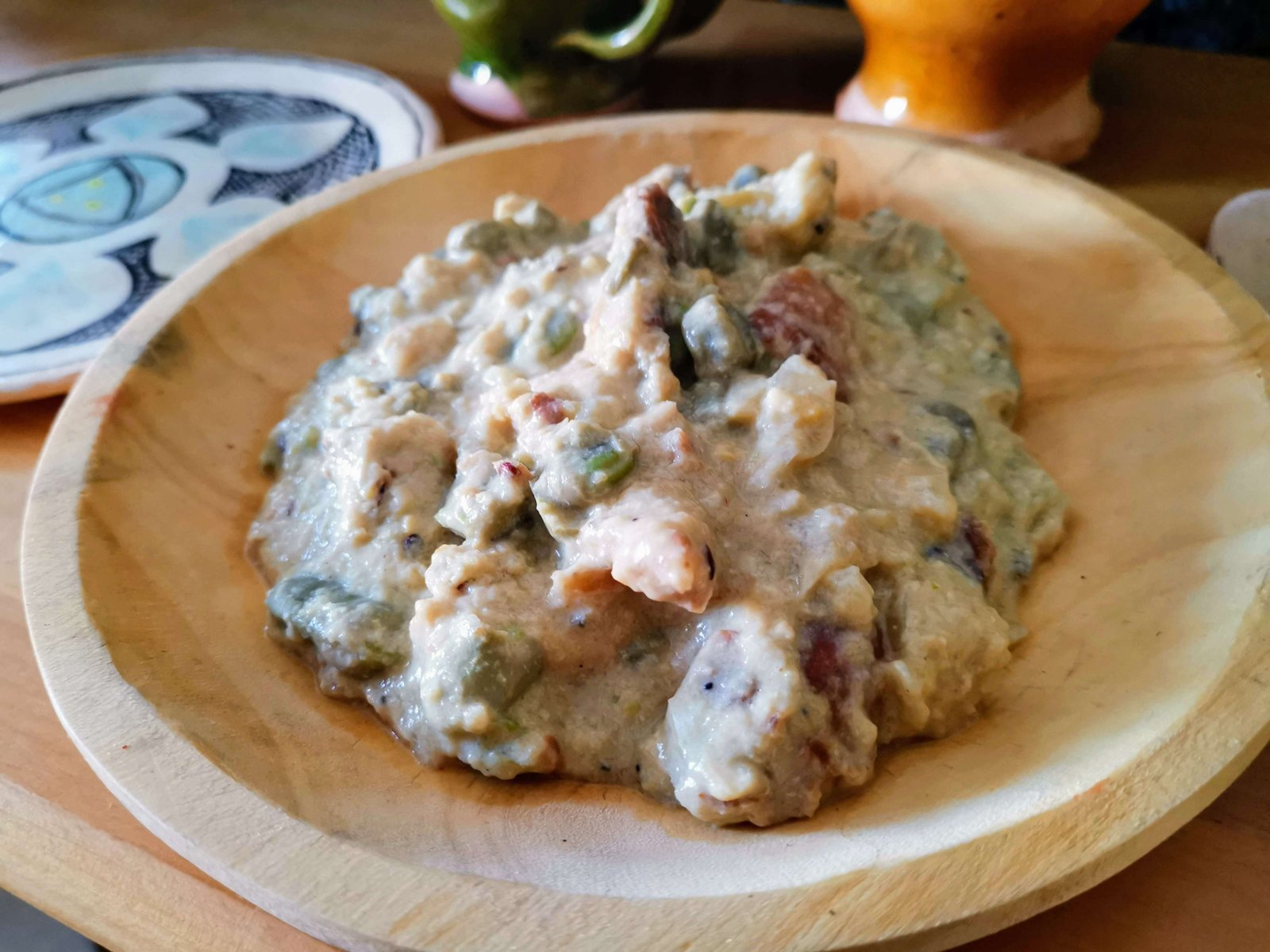 Voici notre interprétation de la Cretonnée de pois ou de fèves nouvelles selon le Ménagier de Paris (XIV°).Votre brouet doit être très épais. Si ce n'est pas le cas, ajoutez du pain sec pour lier davantage. Vous pouvez faire une variante en ajoutant des morceaux de lard revenus avec le poulet.Cette recette est également présente dans le Viandier de Sion (XIII°).